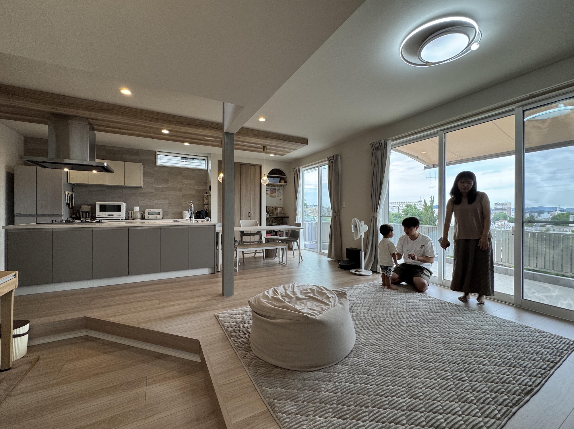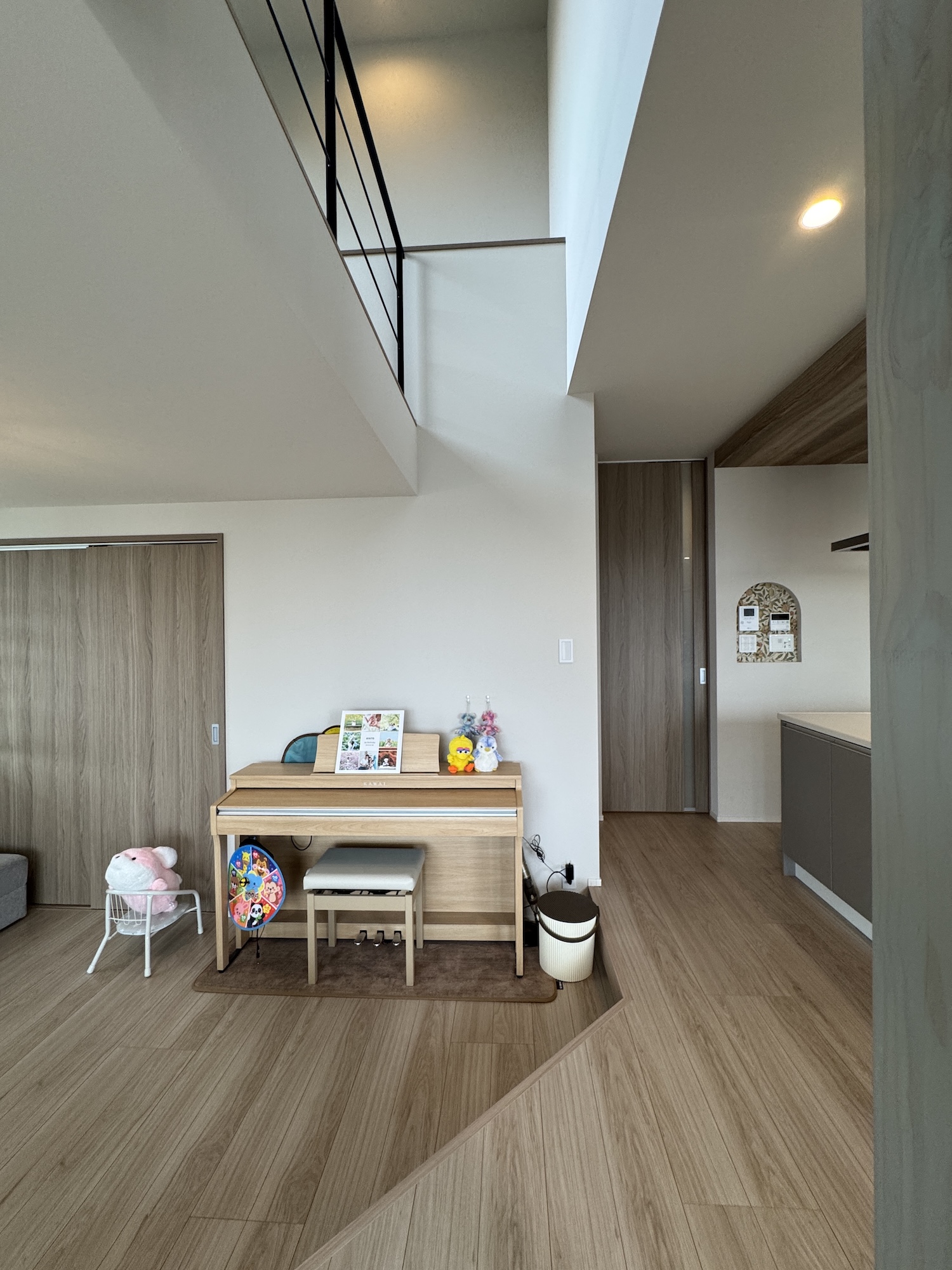 リビングに一段下がったスペースがあり、お子さまがちょこんと座れるようになっています。段差にお子さまが腰かけて、奥さまが電子ピアノを弾いて、歌ったり踊ったり。