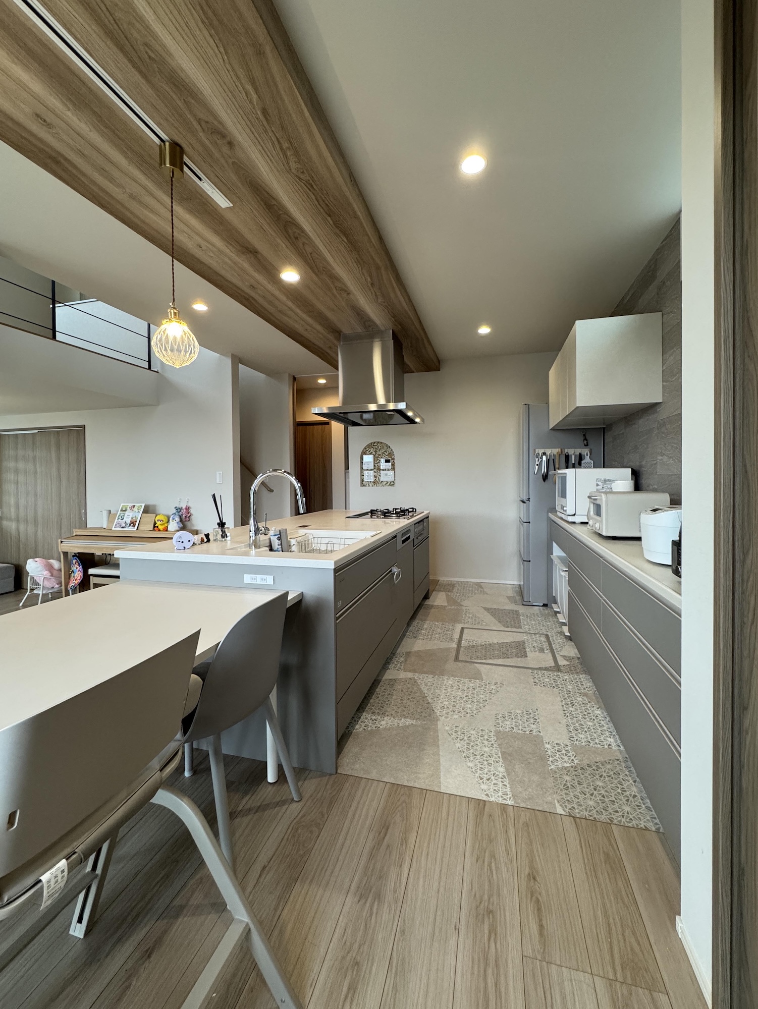 キッチン横にダイニングテーブルを置き、調理した後に料理がスムーズに運べるようになっています。キッチンからは、リビング全体が見渡せるようになっており、お子さまを見守りながら家事ができるのも良いですね♪