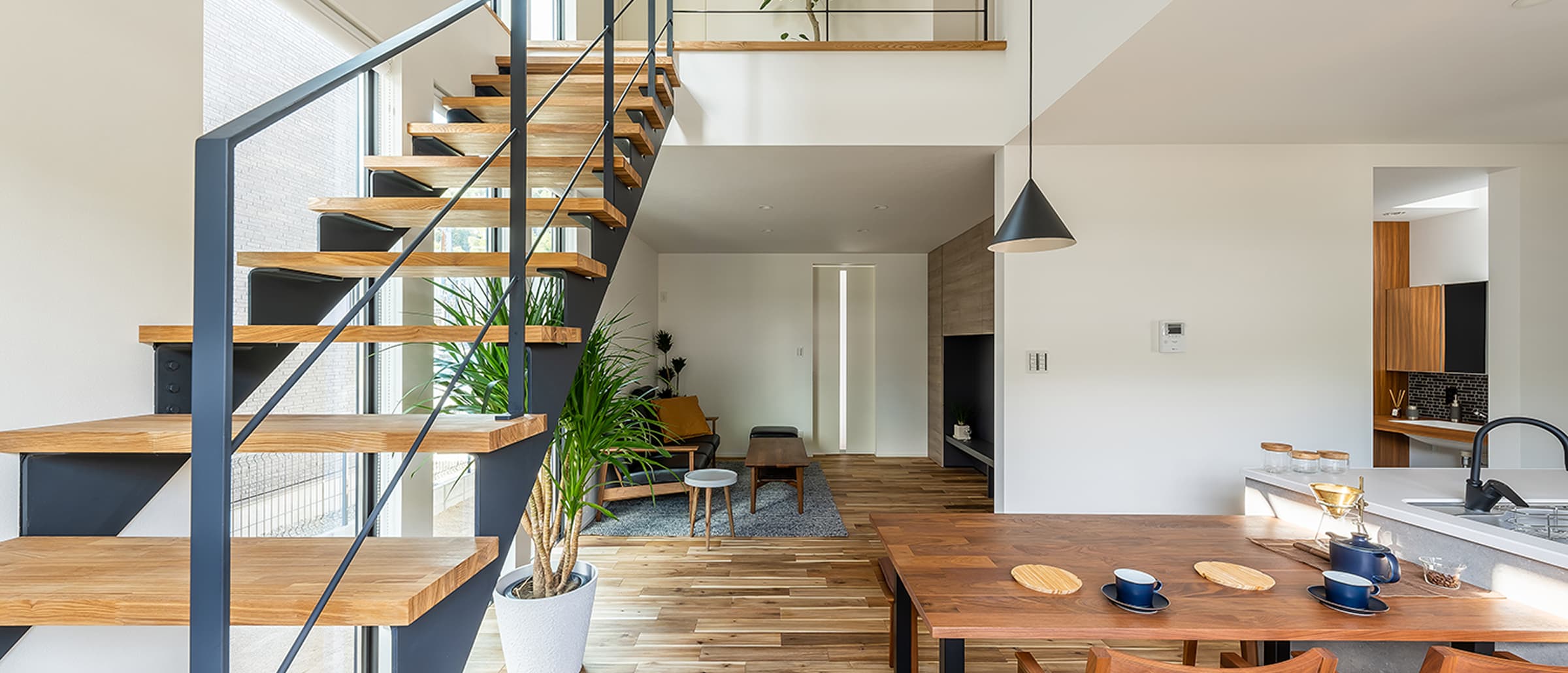 シンプルで洗練されたモダンなデザインに、自然素材のやさしさを融合させることで、飽きのこないナチュラルモダンの空間を実現しています。